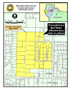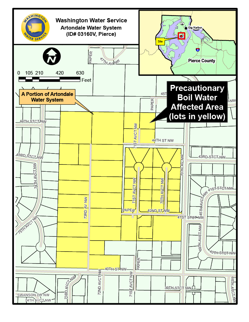 Washington Water Service is advising the 48 homes/lots highlight on the map below, served by our Artondale Water System in Pierce County that on March 18, 2026, that our staff will be in your neighborhood to repair a water line leak. Our staff will begin shutting down the water system at 8:00 a.m. and water service is expected to be completely restored by 4:30 p.m. Due to depressurizing this area of the water system we are advising you to use boiled tap water or bottled water for drinking or cooking after your water service is restored. We are advising you to take this precautionary measure due to the leak repair which has the potential to affect water quality. Boiling kills bacteria and other organisms that may have been introduced into the water.