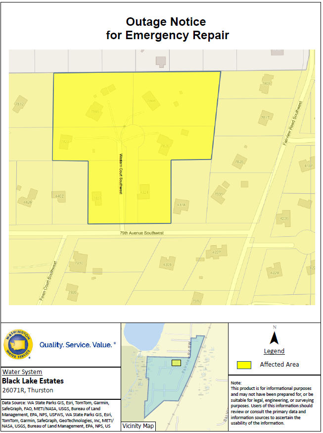 Today, February 7, 2026, our staff is working in your neighborhood to repair a leak on the water main that serves your home. This requires that we depressurize a section of the water system, resulting in an outage to the 6 homes/lots highlighted on the map below.