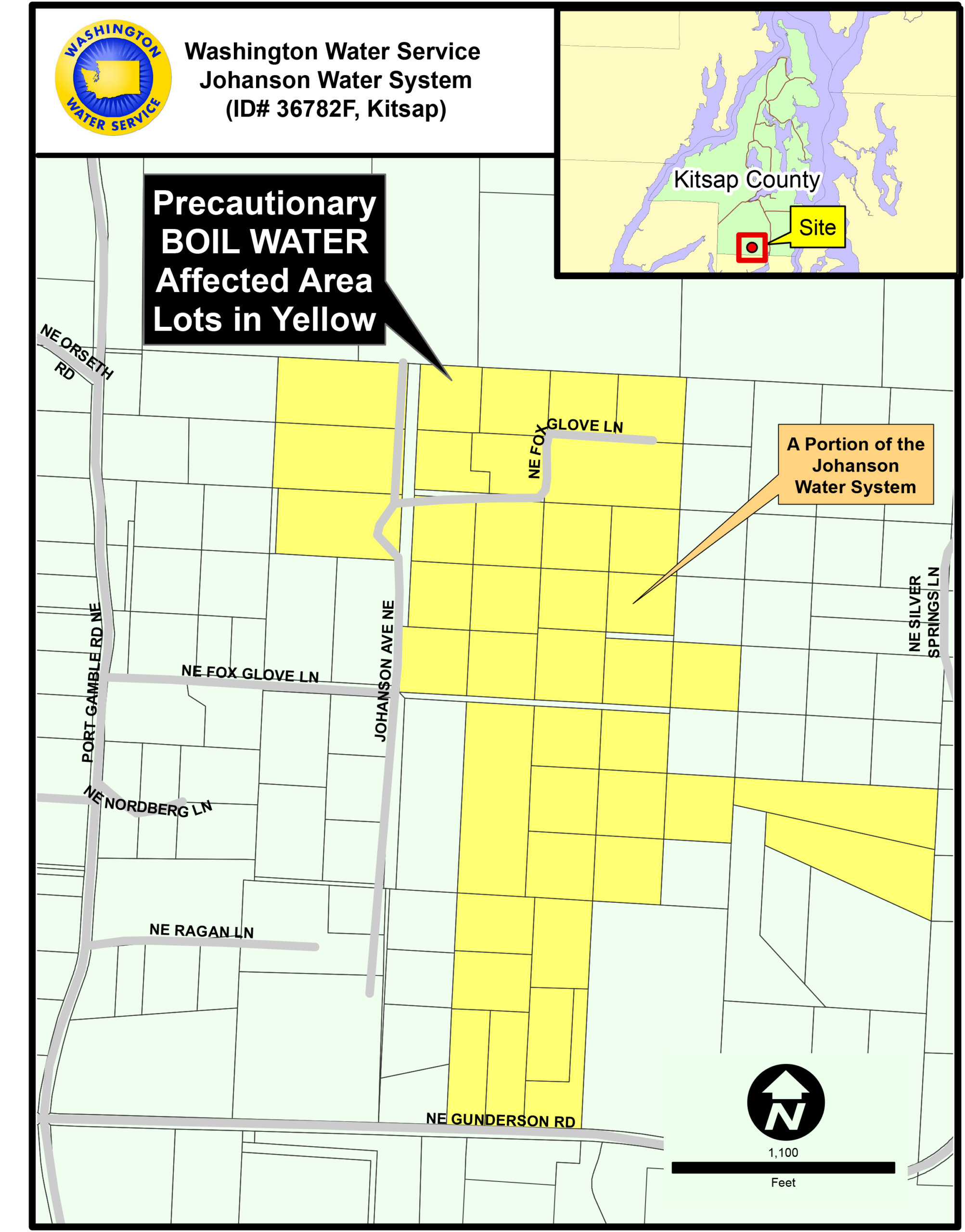 Washington Water Service is advising customers residing in the highlighted area of the map below (approximately 30 customers), served by our Johanson Water System in Kitsap County to use boiled tap water or bottled water for drinking or cooking until further notice.